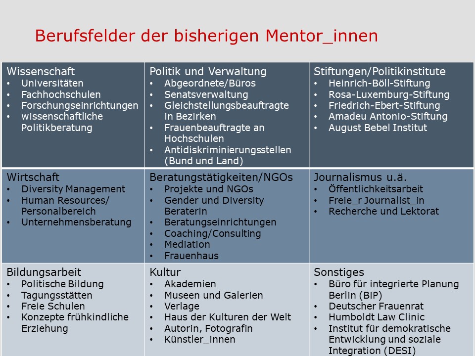 Die anliegende Übersicht zeigt die Berufsfelder der bisherigen Mentor_innen (zur vergrößerten Ansicht in neuem Tab bitte auf die Abbildung klicken):
